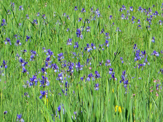 Die seenahen Wiesen im Eriskircher Ried werden fast jedes Jahr wochenlang überflutet, sie zählen zu den wertvollsten Biotopen. Von Mitte Mai bis Anfang Juni färben tausende Sibirische Schwertlilien die Riedwiesen blau, in das einige gelber Tupfer der Wasser-Schwertlilie eingestreut sind. Wir waren begeistert von dieser Farbenpracht. Die Sibirische Schwertlilie, auch Iris genannt, ist eine stark im Bestand gefährdete Art, die am Bodensee bundesweit wohl die schönsten Bestände aufweist. Der Name leitet sich von der Verbreitung der Art ab, die bis Westsibirien reicht. Es handelt sich aber um eine ursprünglich heimische Wildpflanze.
