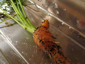 Der kleine Bruder zieht Karotten vom Dachgärtchen für unsere Suppe. Er entdeckt eine mit einer Nase.