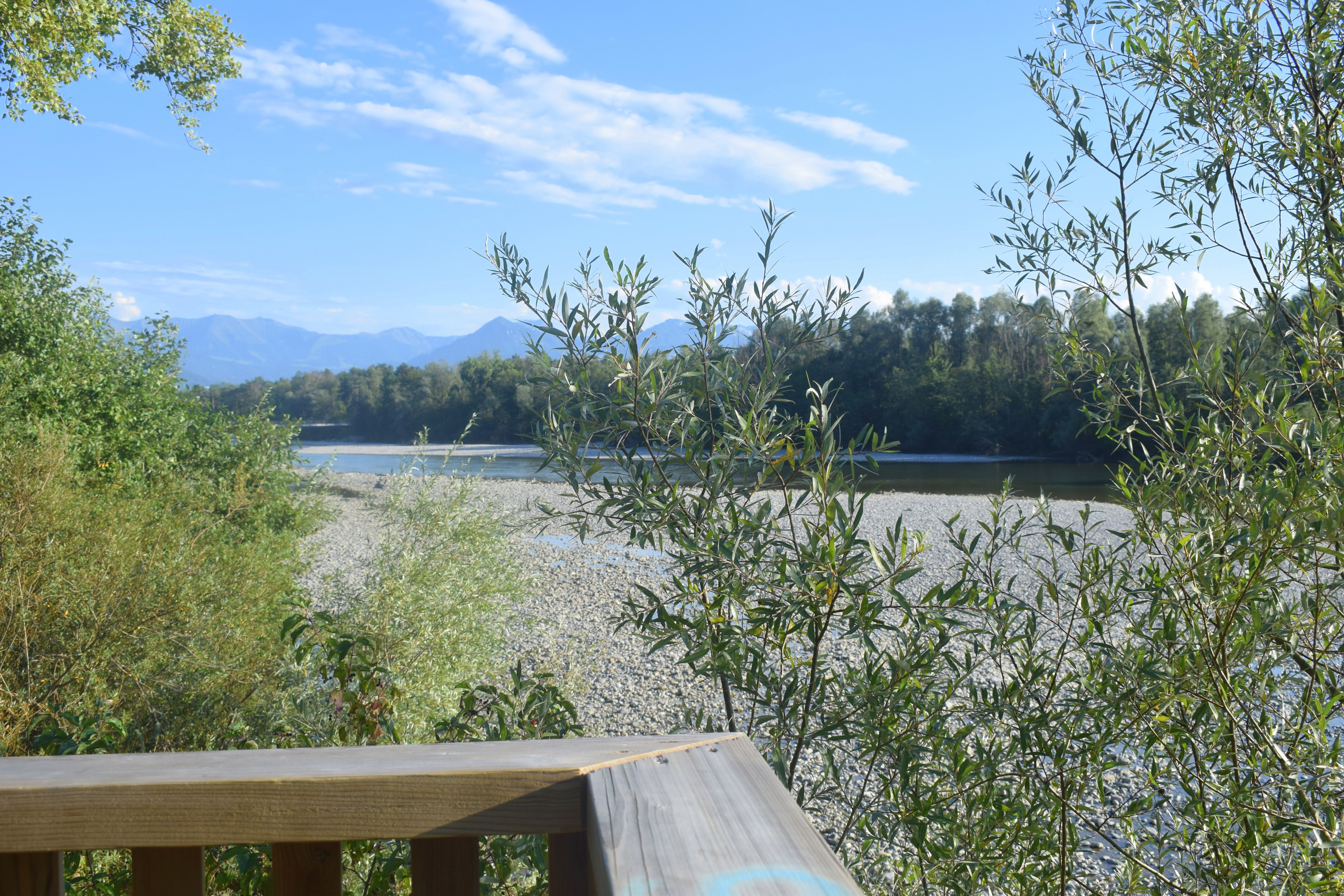 Bregenzerachmündung. Wir spazieren um den Wocherhafen zum Alten Wurzelbaum und folgen dann dem Uferweg von der Mündung der Dornbirner Ach bis zur Fußgängerbrücke. So wunderbar ruhig ist es hier.